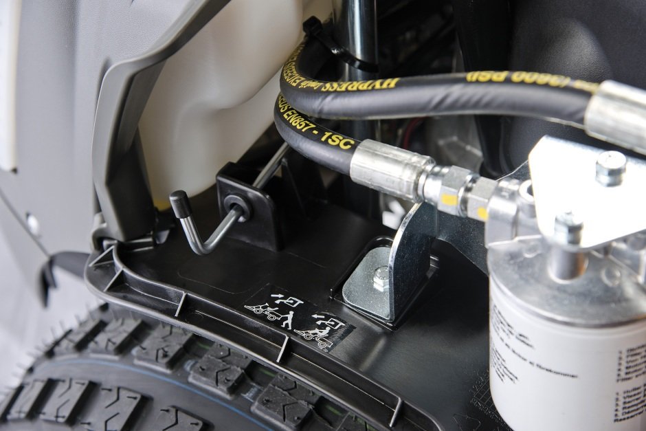 Ein Hydrostatantrieb per trägt zusätzlich zur Manövrierfähigkeit bei, indem er ein sanftes Beschleunigen und Abbremsen ohne manuelle Schaltvorgänge ermöglicht; durch die Allradtauglichkeit lassen sich Hänge, unebener Boden und schlammige Stellen problemlos überwinden.