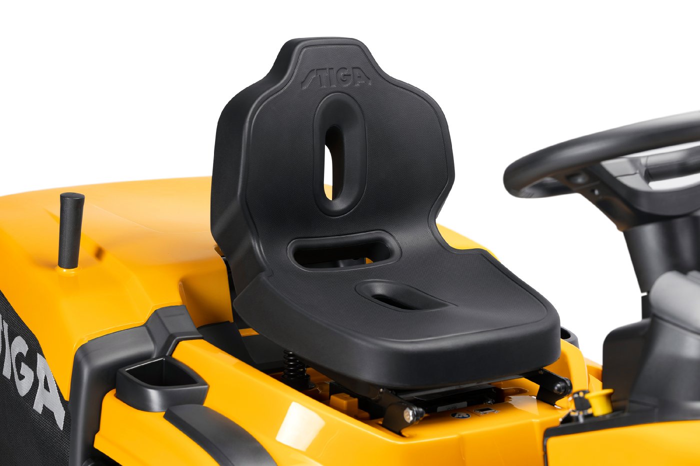 Das ergonomische STIGA Lenkrad in Verbindung mit dem verstellbaren Hochlehner STIGA Classic macht das Fahren zum Vergnügen.
