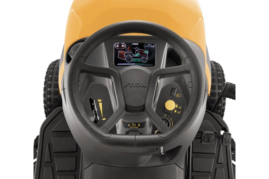 Er verfügt über ein 5,5-Zoll-Farbdisplay, das alle wichtigen Betriebsanzeigen übersichtlich und leicht ablesbar darstellt. Die STIGA Best Cutting Zone-Funktion zeigt dem Bediener dank der Grünlichtanzeige immer an, wann er die beste Schnittleistung erzielt, unabhängig von Gelände und Grasart. Außerdem verfügt er über ein hydrostatisches Fußpedalgetriebe, mit dem der Fahrer die Fahrgeschwindigkeit stufenlos steuern kann, ohne anhalten und manuell schalten zu müssen.